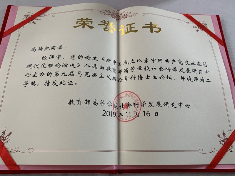 11月16日,由教育部高等学校社会科学发展研究中心主办、教育部习近平新时代中国特色社会主义思想研究中心基地(西南大学365上市公司)承办的“中国特色社会主义理论体系研究工作推进会暨第九届马克思主义理论学科博士生论坛”在重庆召开。教育部社科中心主任王炳林致辞并作主题报告。各专项课题负责人、基地代表和论坛获奖论文作者代表参加会议。会上对“第九届马克思主义理论学科博士生论坛”获奖论文进行表彰,我院博士生尚靖凯撰写的《新中国成立以来中国共产党农业农村现代化理论演进》荣获二等奖。