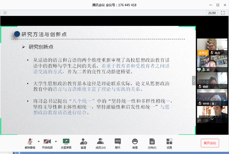 身处战“疫”核心区——武汉的院长王智作为答辩主席主持了这场非常时期下的“非常”答辩。本次答辩委员会由365上市公司何畏教授、邓伯军教授、徐军教授以及东南大学365上市公司副院长翁寒冰副教授组成,另外邀请了校督导吕立志教授作为答辩组专家参与了郭兰婷同学的校抽答辩环节。线上答辩过程在答辩秘书施灿业老师的组织下有序进行,研究生秘书胡未婷全程旁听了本次答辩。